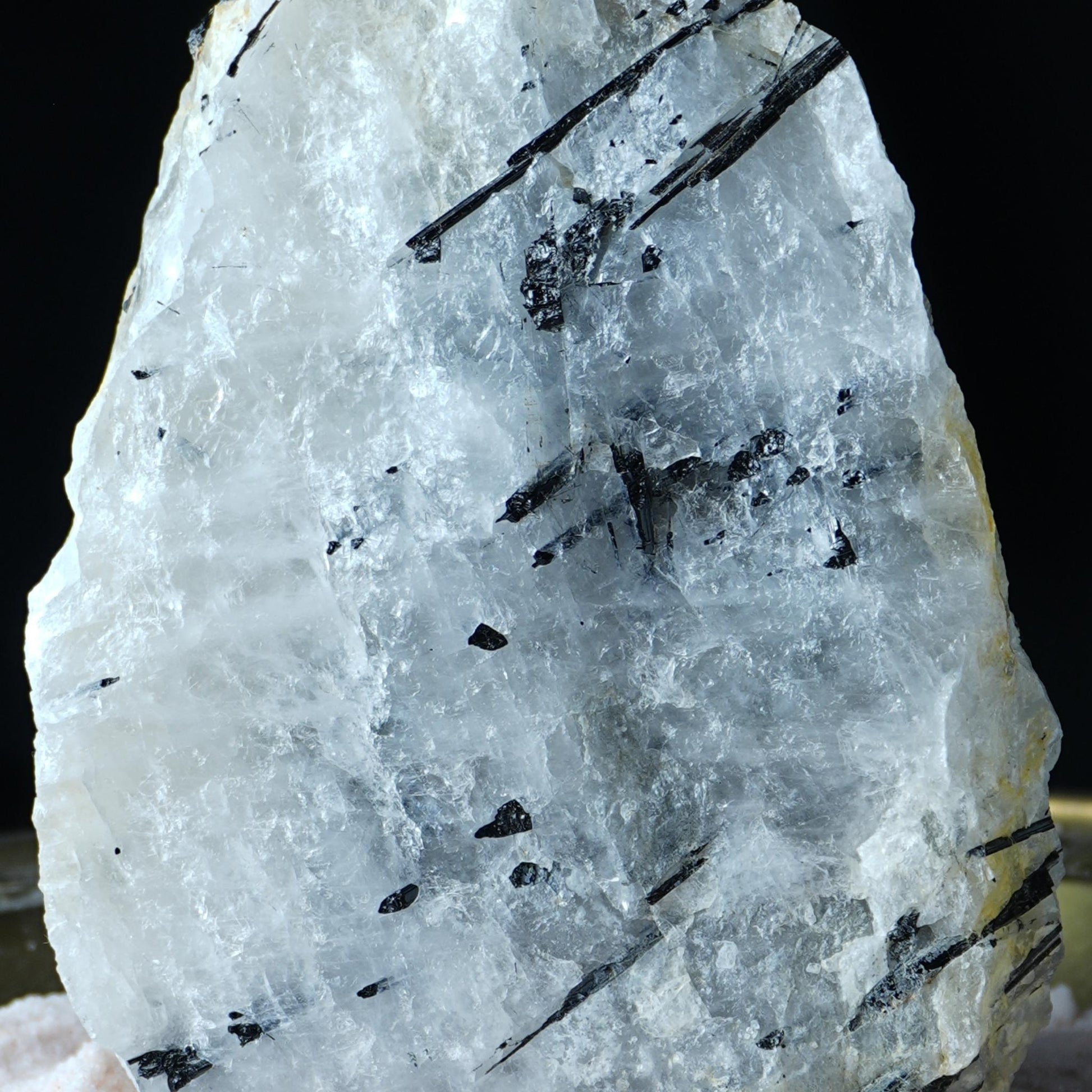 Fehéres–áttetsző kvarctestében fekete, szalmaszálszerű turmalinszálak futnak végig – természetes rajzolatok, amelyek nem díszítenek, hanem őriznek.