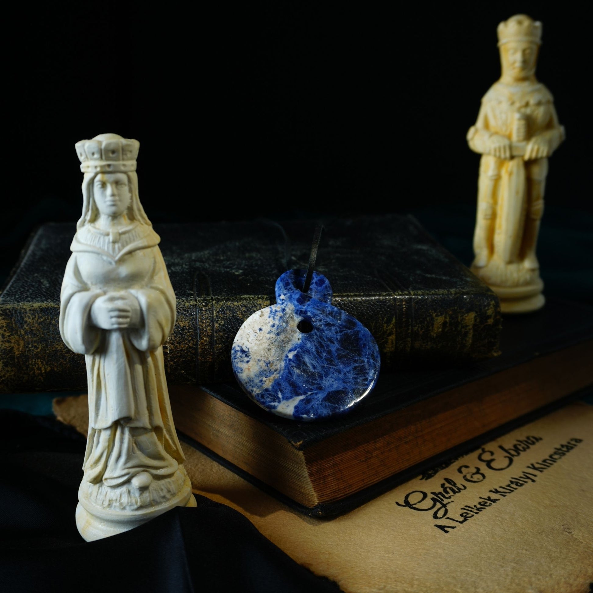 A mély éjkék szodalitot fehér rajzolatok törik meg, mintha a tenger hulláma festette volna rá saját történetét.