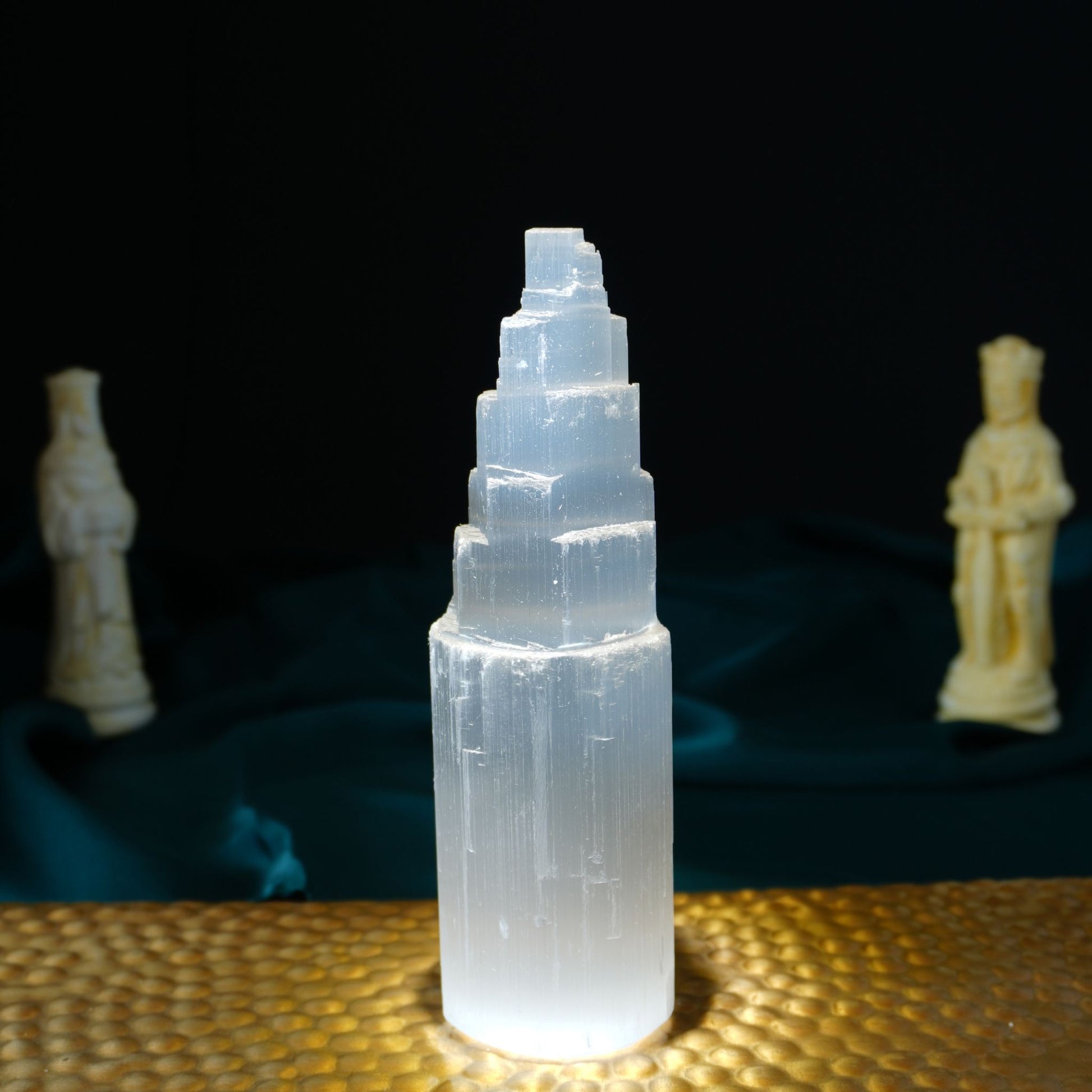 A szelenit torony úgy áll, mint egy fényből faragott hegycsúcs — tiszta, hófehér ragyogása felfelé vezet, mintha a tér energiája a csúcsán át a magasabb szférákba áramlana.